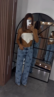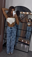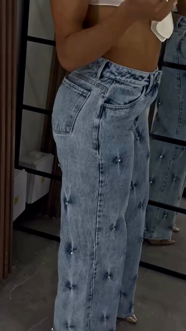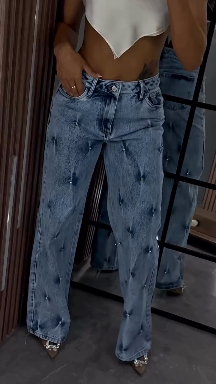 These wide-leg jeans are embellished with eye-catching embellishments, adding a touch of glamour and personality. These sophisticated details create a striking and unique look.