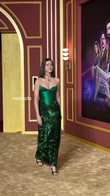 This gown is stunning in a striking emerald green. Its structured bodice is cut for a slim fit, accentuating the waist. The sweetheart neckline accentuates the shoulders and décolletage, adding a touch of femininity. The skirt is embellished with shimmering green sequins or ruffles, creating a captivating, dynamic silhouette. The texture and sheen of the skirt complement the feminine bodice, making it perfect for high-profile events like award shows or formal evenings. As shown, complete the look with a statement necklace. Minimal accessories also enhance the gown's unique design.