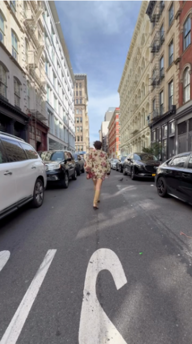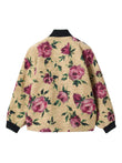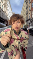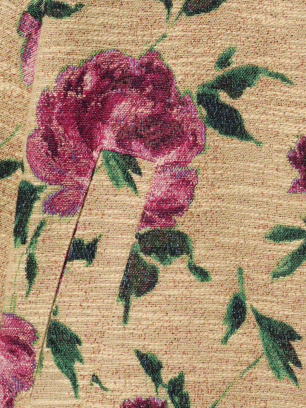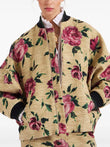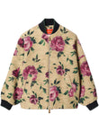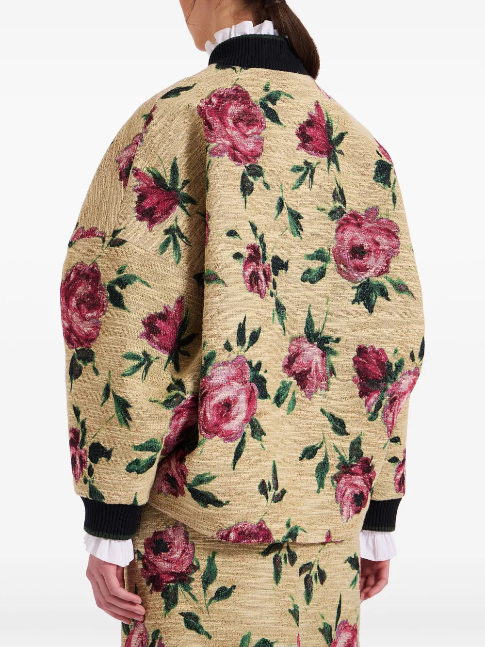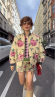 Floral Bomber Jacket and Shorts Ensemble with large pink floral patterns, paired with matching floral shorts. Underneath, there's a pink and black patterned knit top. The outfit is complemented by beige knee - high boots and accessorized with large gold hoop earrings, brown sunglasses, and a red clutch bag. This look is suitable for a stylish, casual day out in an urban setting, exuding a vibrant and fashionable vibe