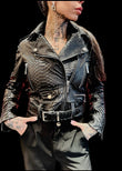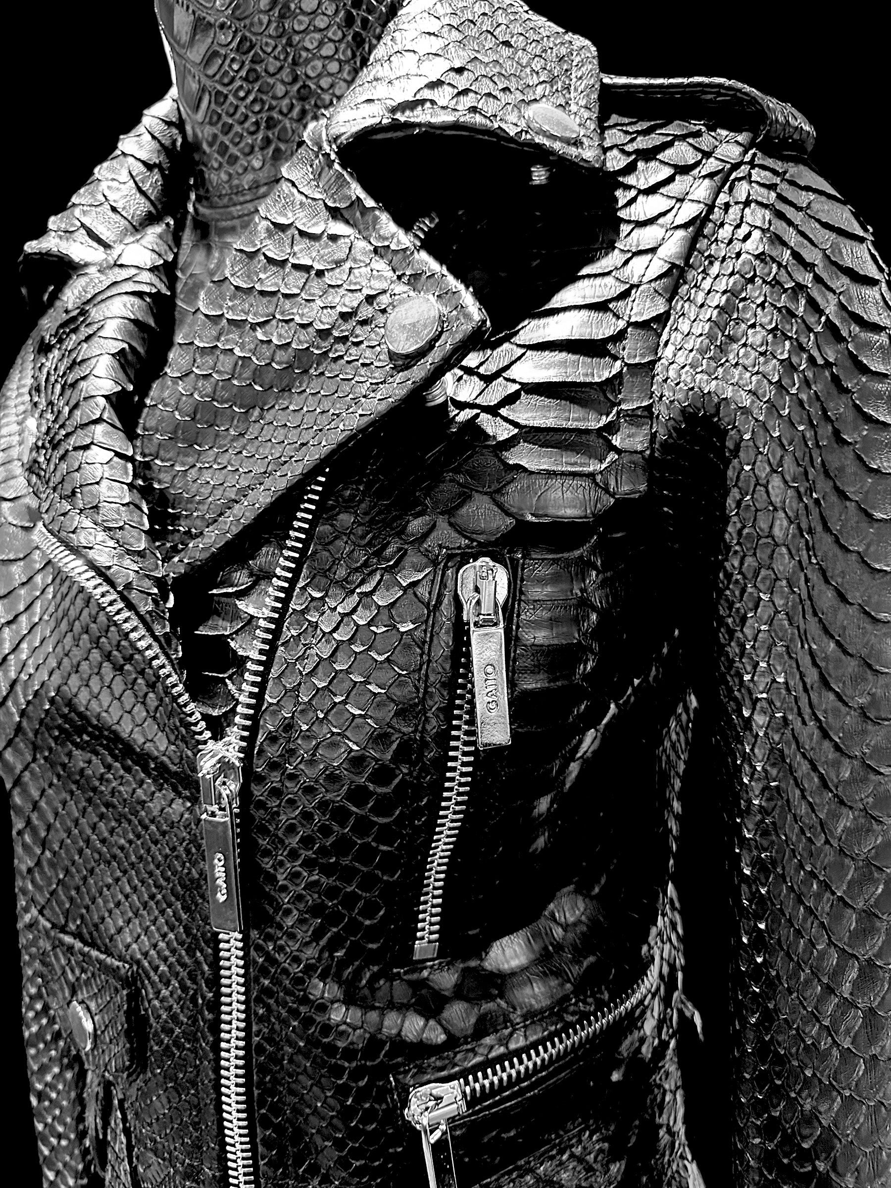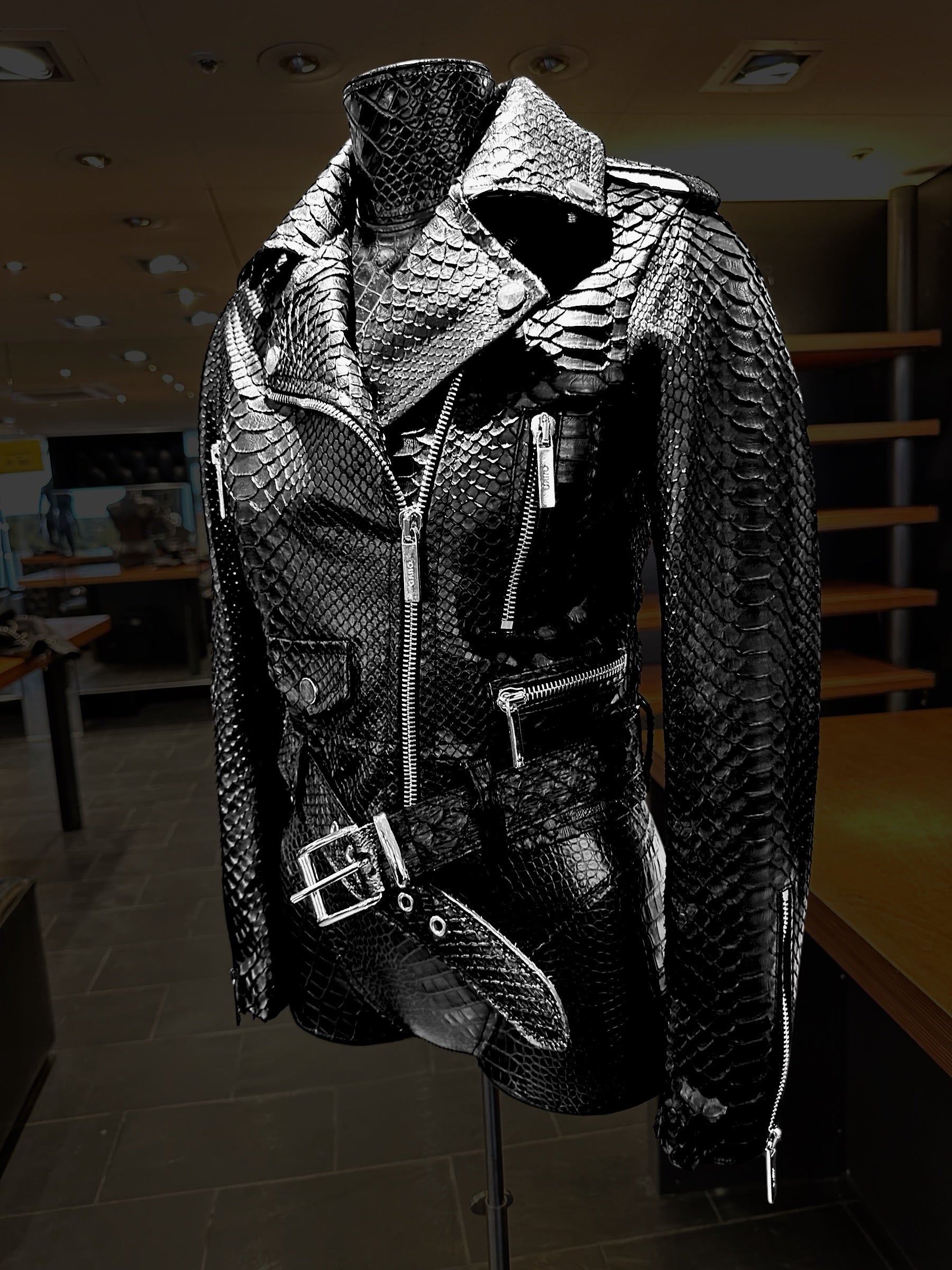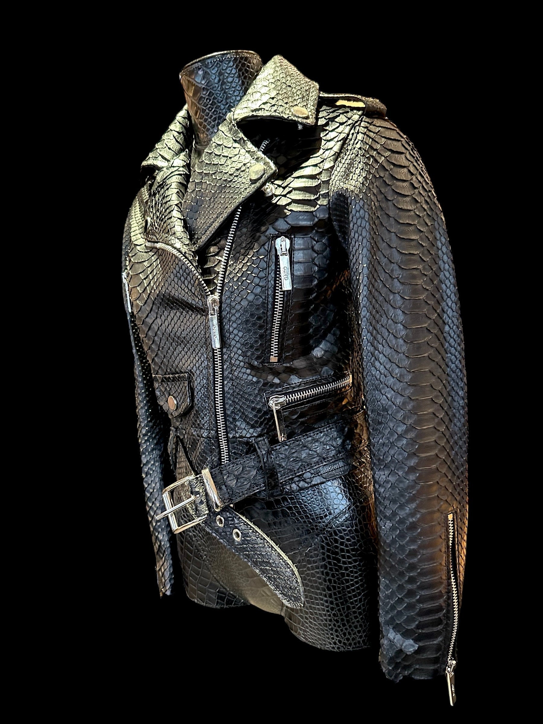 Make a bold statement with this Black Python - Embossed Leather Moto Jacket. The unique snake - skin texture and edgy moto design create a fierce, standout look. Perfect for adding attitude to any outfit. Lightweight construction ensures fast page load. Shop now for a daring, stylish piece!