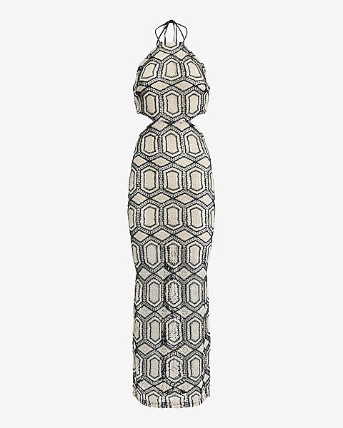 Geometric - Patterned Halter Cut - Out Maxi Dress