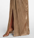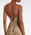 This gold maxi dress features a corseted bodice, a sweetheart neckline, and spaghetti straps for a feminine look. The pleated skirt adds a touch of sophistication, while the metallic gold fabrication lends a luxurious, alluring feel.