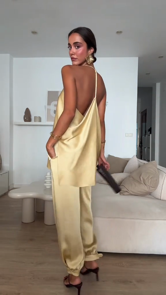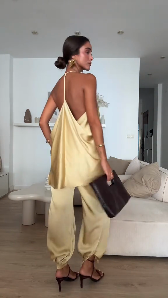 Gold Satin Halter Neck Top & Pants Set