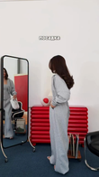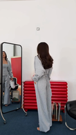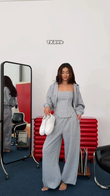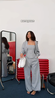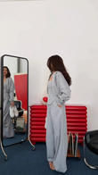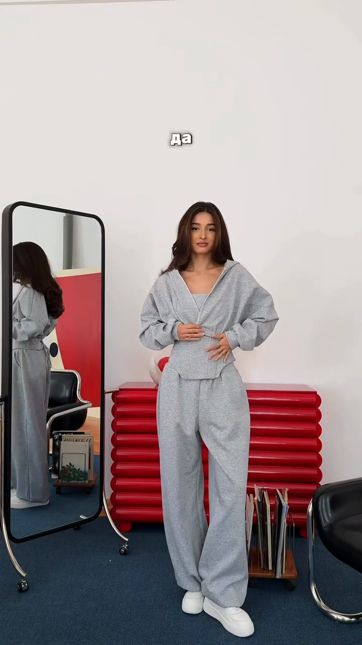 This outfit consists of a gray hooded sweater paired with matching wide - leg sweatpants, creating a coordinated loungewear look. The sweater appears to have a cropped or shorter length, and the set is complemented by white sneakers. Ideal for casual, comfortable wear, whether at home, running errands, or for a relaxed outing. The setting, with a large mirror, a red cabinet, and black furniture, adds a modern touch to the presentation of the outfit.