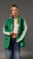 Green Faux Leather Jacket with White Striped Sleeves