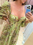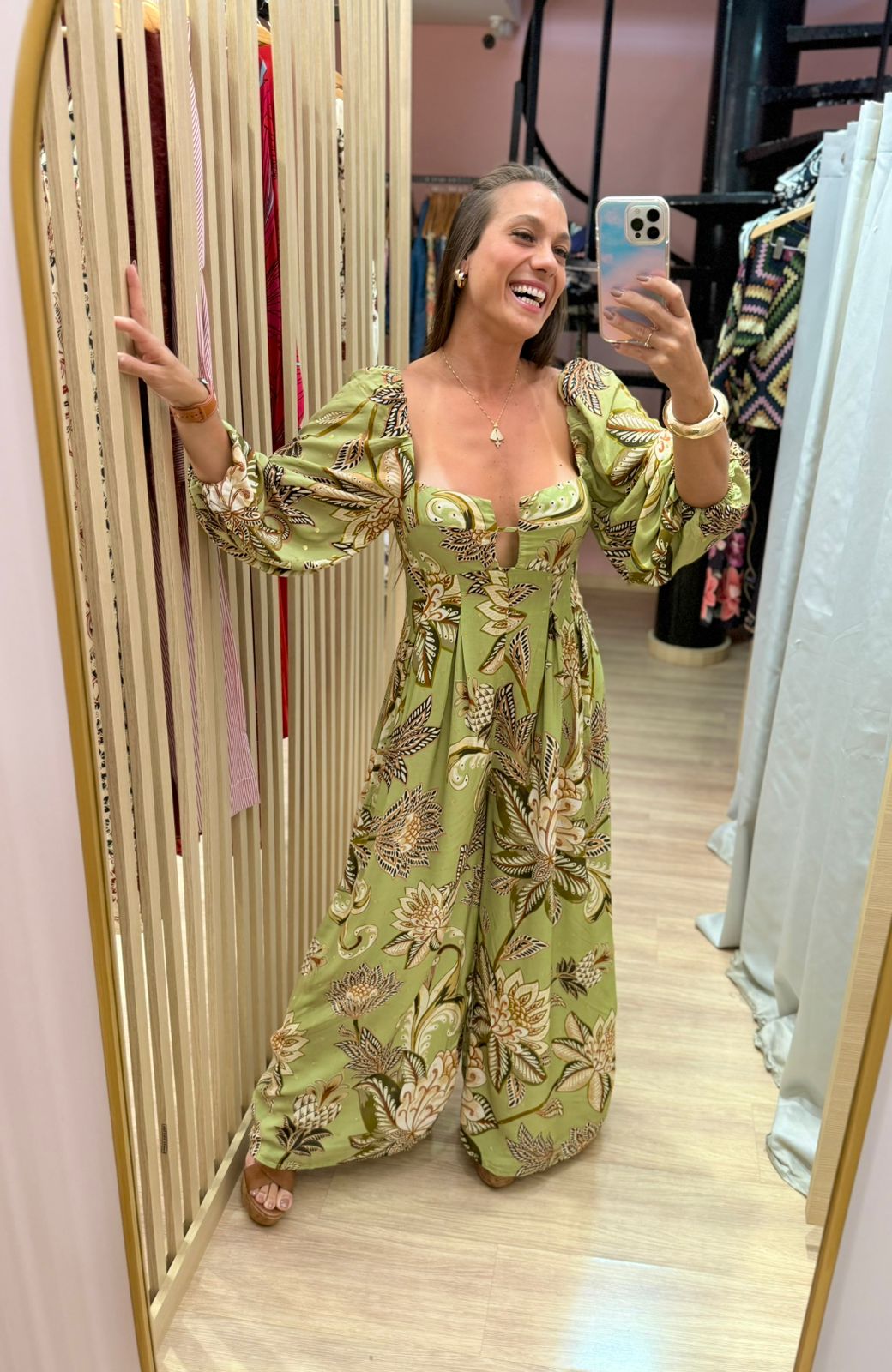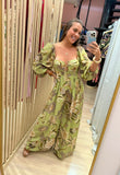 Green Floral Puff Sleeve Wide Leg Jumpsuit