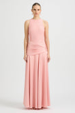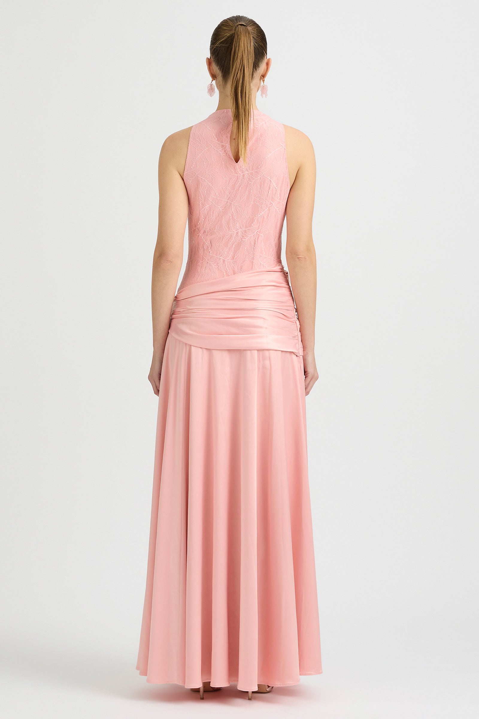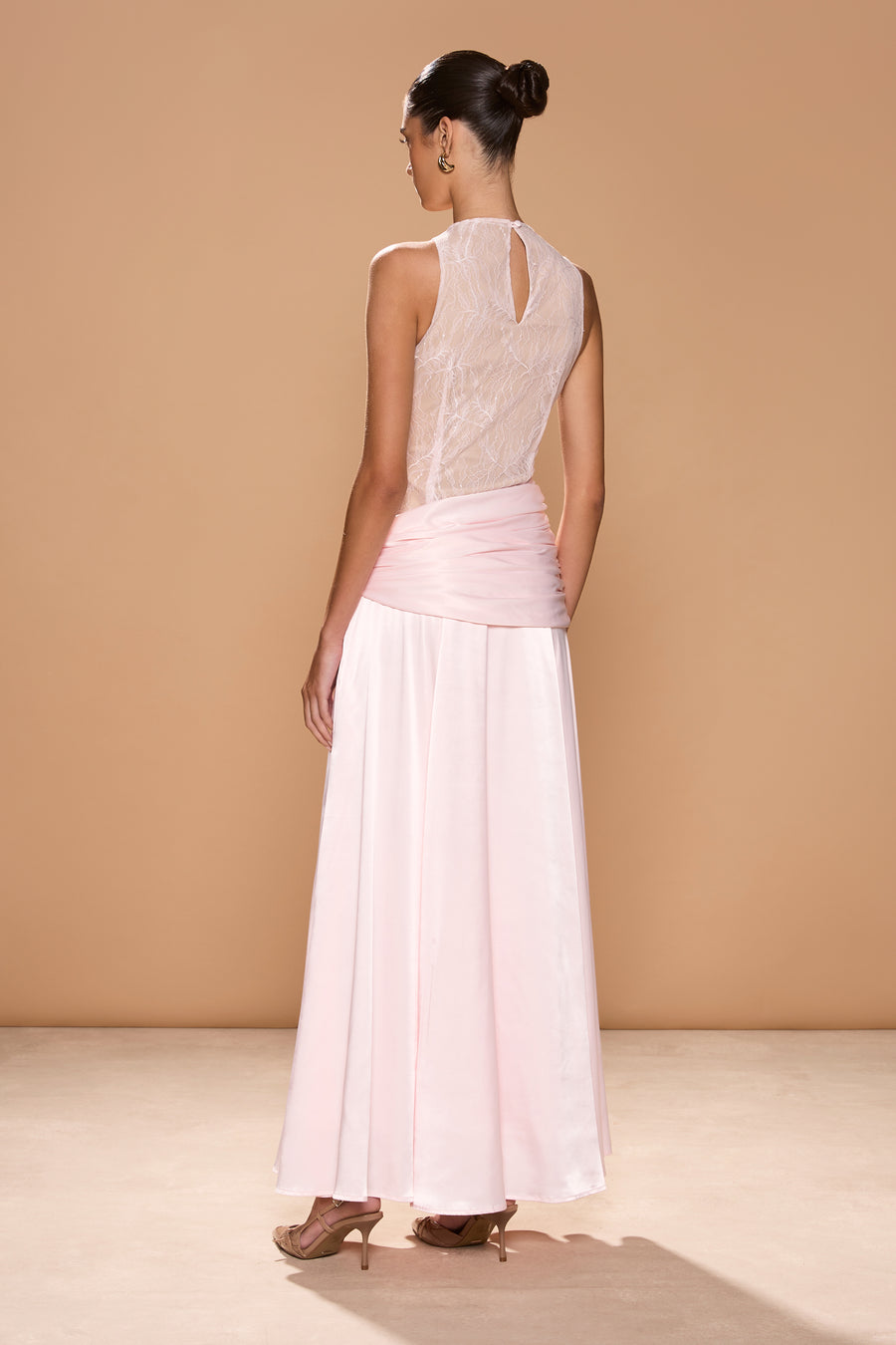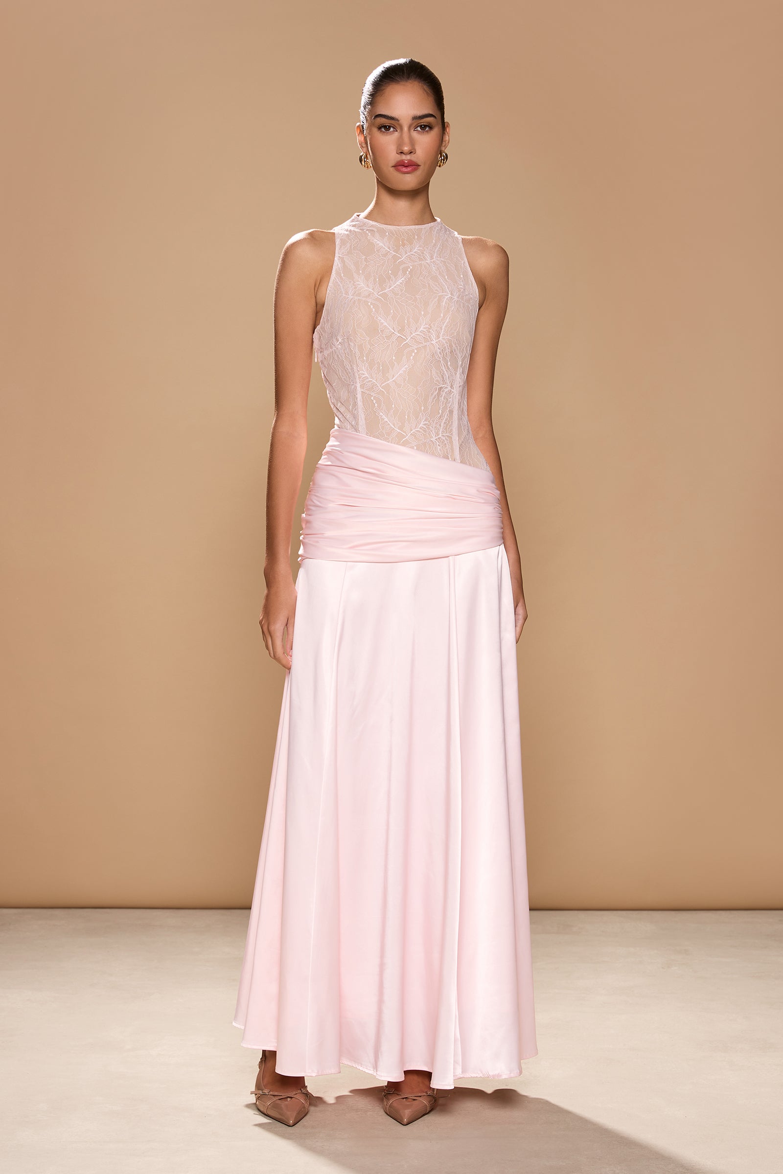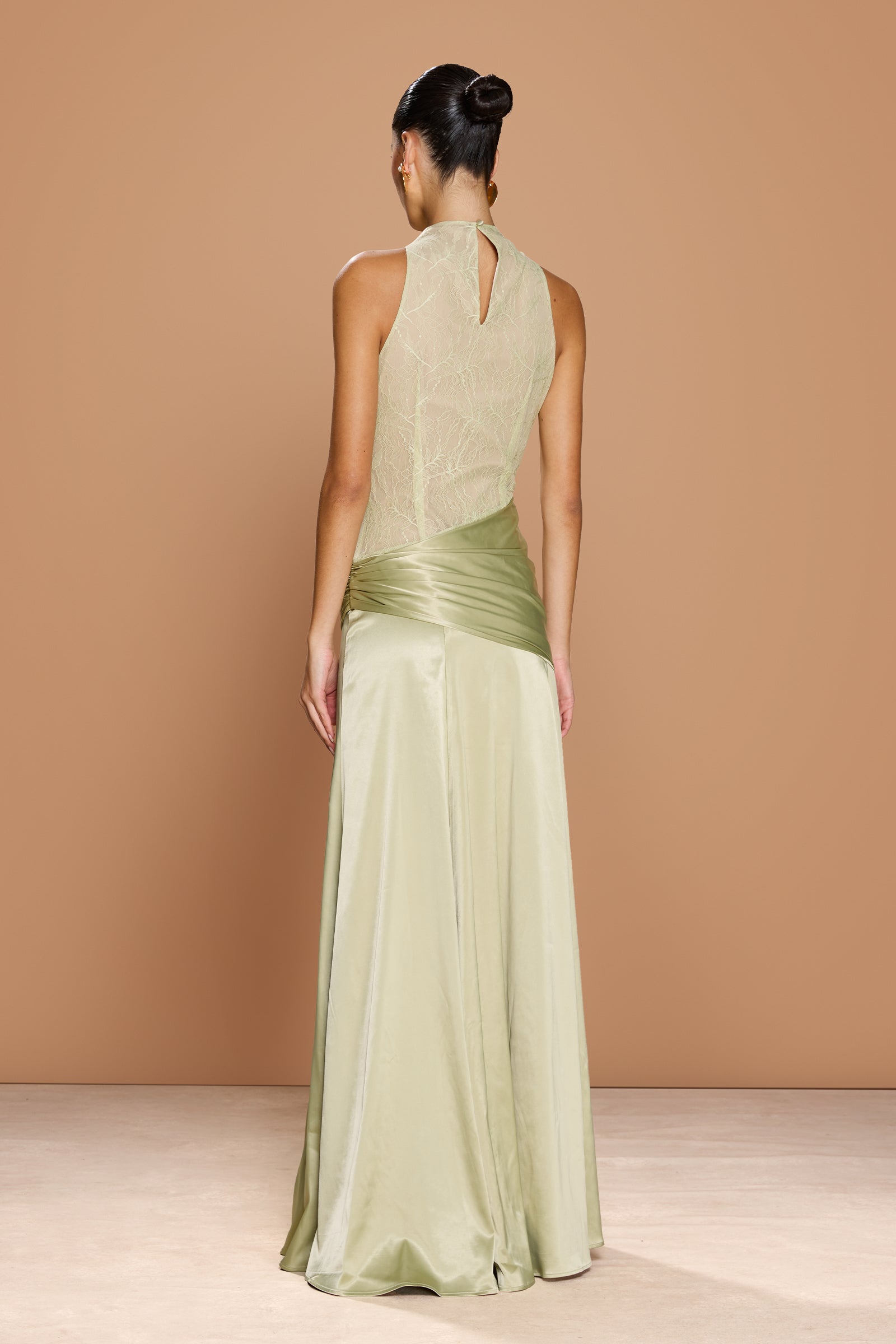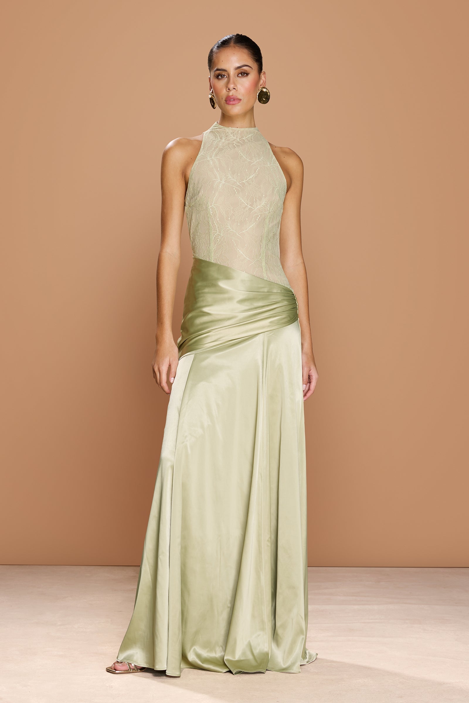 High-neck lace and satin maxi dress