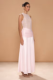 This long dress features a high-neck lace bodice for a refined and elegant look. The satin skirt, pleated at the waist, creates a flowing, graceful silhouette and adds to the overall elegance.