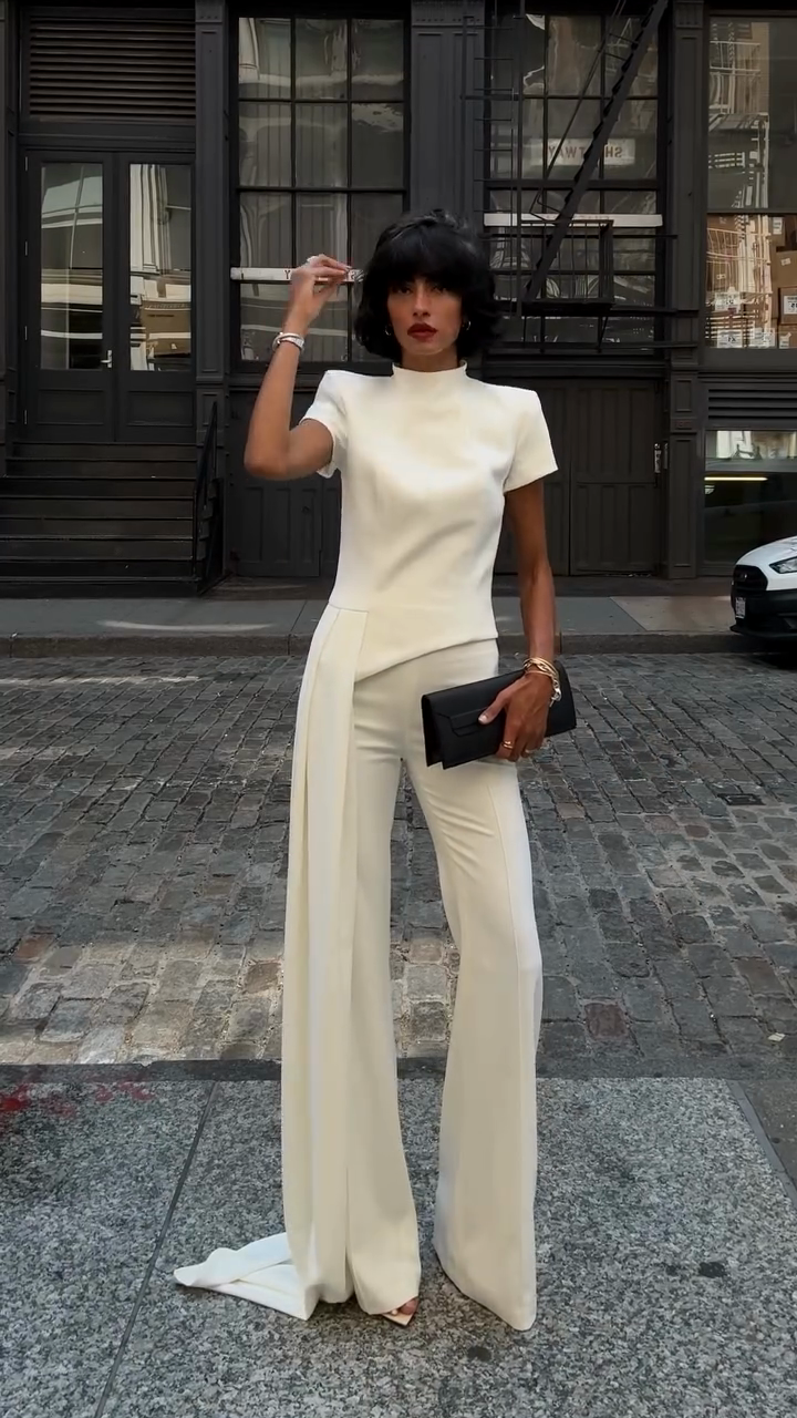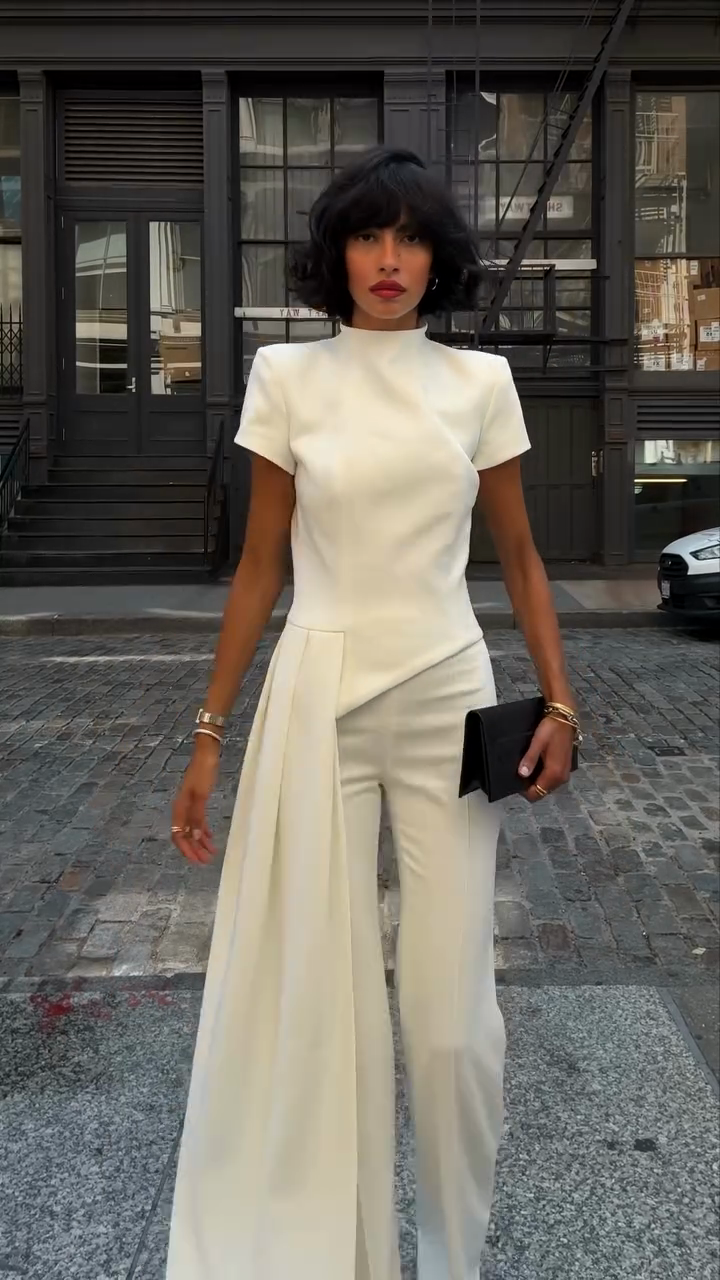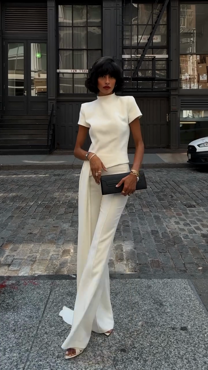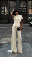 Ivory High - Neck Short - Sleeve Top and Wide - Leg Pant Set