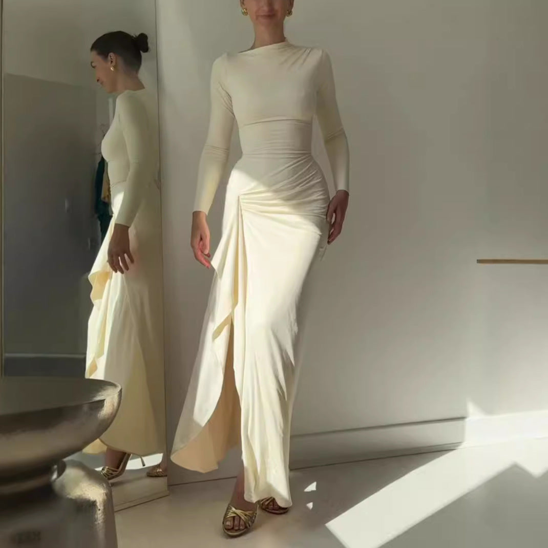 Elevate your elegance with this Ivory Ruched Asymmetric Maxi Dress. The figure - hugging silhouette, ruched detailing, and asymmetric drape create a sophisticated, red - carpet - ready look. Perfect for formal events or special occasions. Lightweight fabric ensures fast page load. Shop now for a timeless, chic outfit!