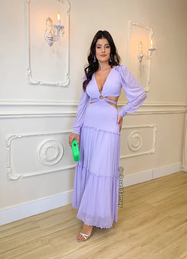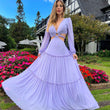 This lavender maxi dress features a plunging V-neck and circular cutouts at the front, creating a playful, modern feel. Slightly puffed long sleeves add an elegant touch, while the tiered ruffled hem creates a flowing, feminine silhouette. The cutouts break up the hemline, highlighting the waist, while the puffy skirt creates an elegant, elongated look, perfect for formal occasions, garden parties, or upscale dinners. The soft lavender color is both stylish and versatile, complementing all skin tones. Complete the look with delicate jewelry and a clutch.