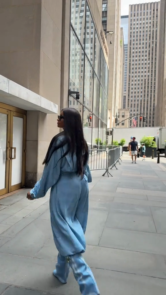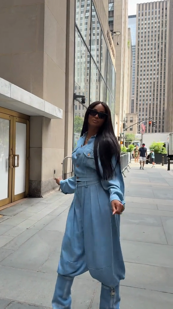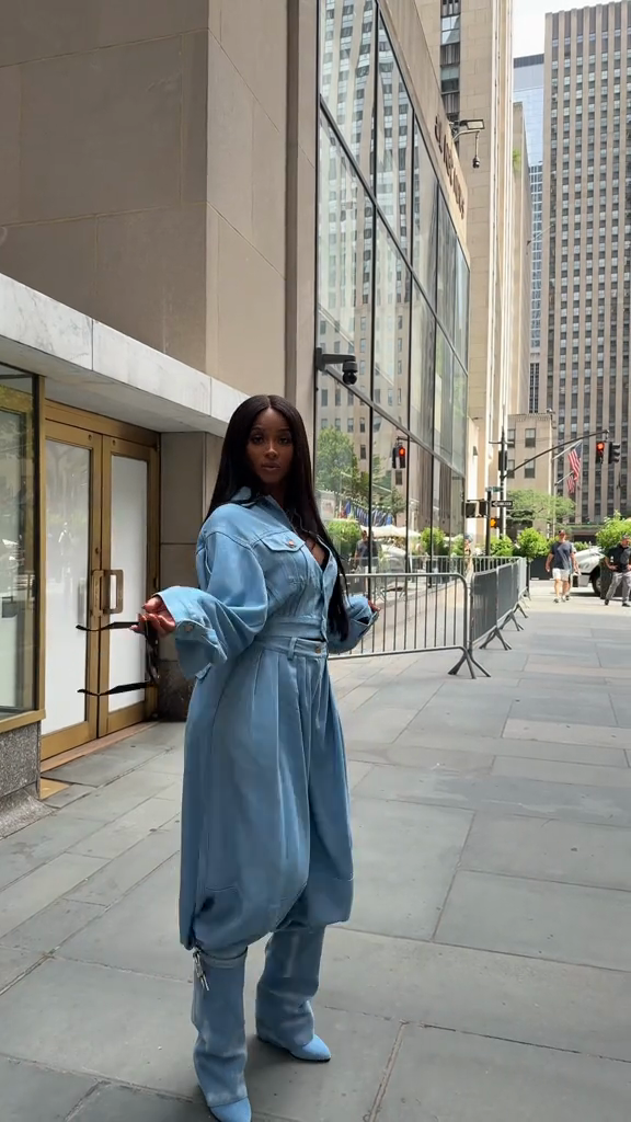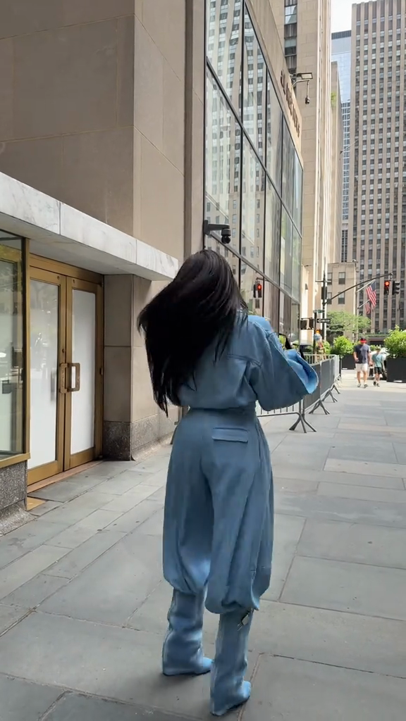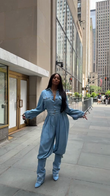 This light blue denim ensemble features a button-down shirt with flap pockets and high-waisted, loose-fitting trousers with a balloon-shaped leg that tapers at the ankle. Paired with a pair of light blue cowboy boots, the outfit creates a cohesive, fashion-forward monochrome look. The design perfectly blends casual comfort with a contemporary edge, perfect for both urban streetwear and stylish daytime outings.