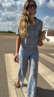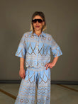 Light Blue Eyelet Embroidered Short - sleeved Shirt and Flared Pants Set