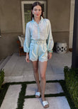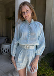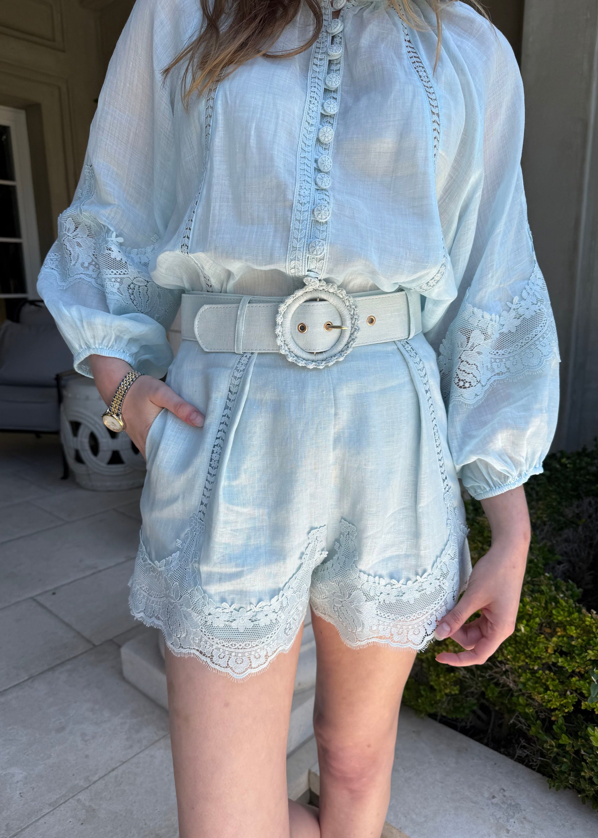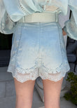 Light Blue Linen - Blend Shirt and Short Set with Lace Detailing
