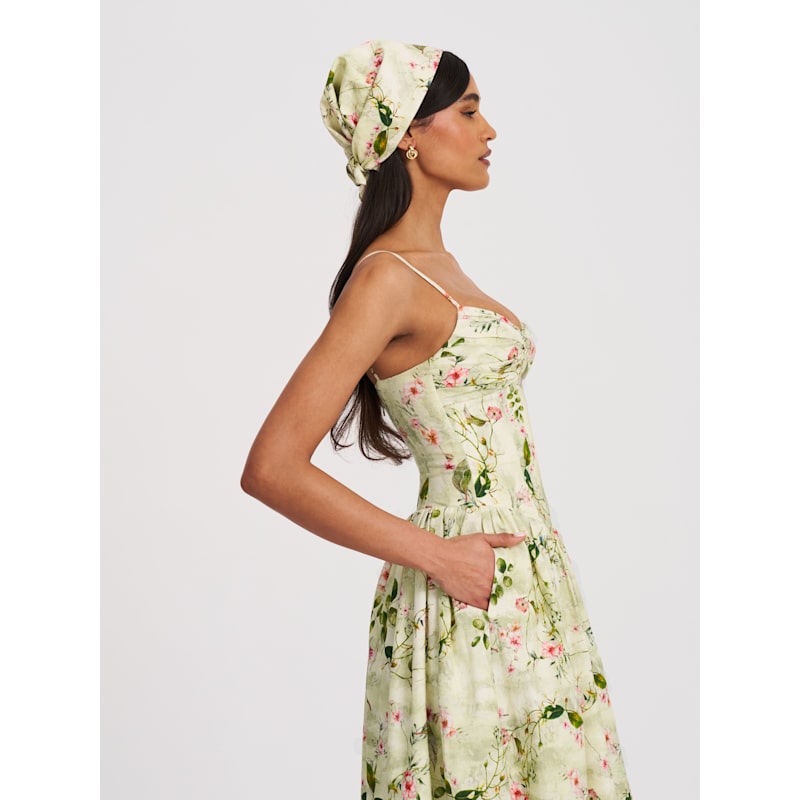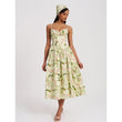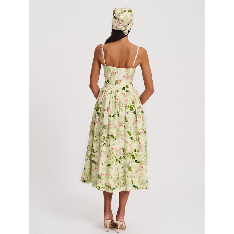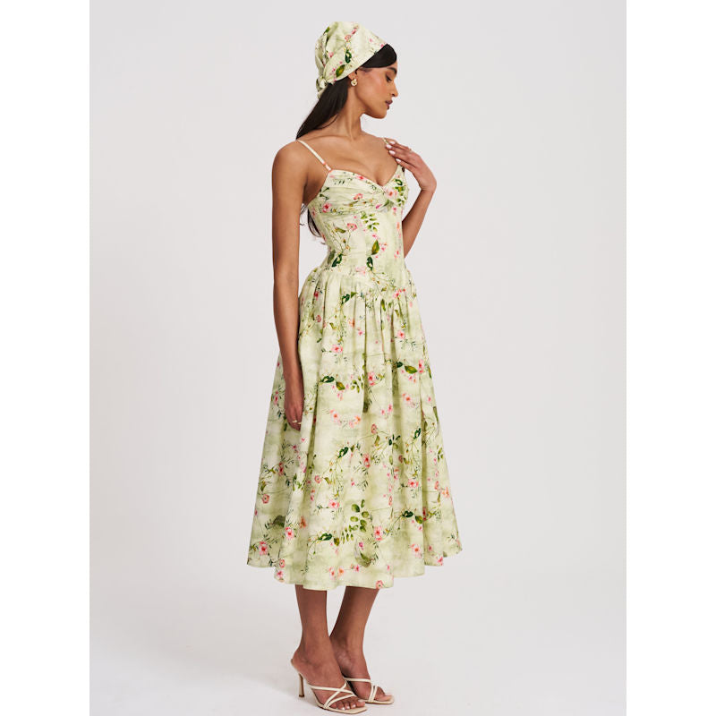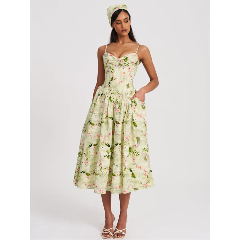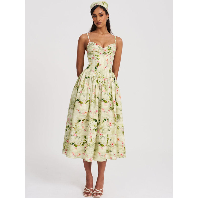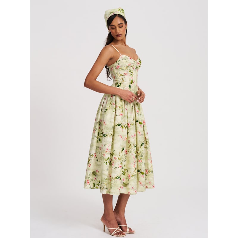 Light Green Floral Print Sweetheart - Neck Midi Dress