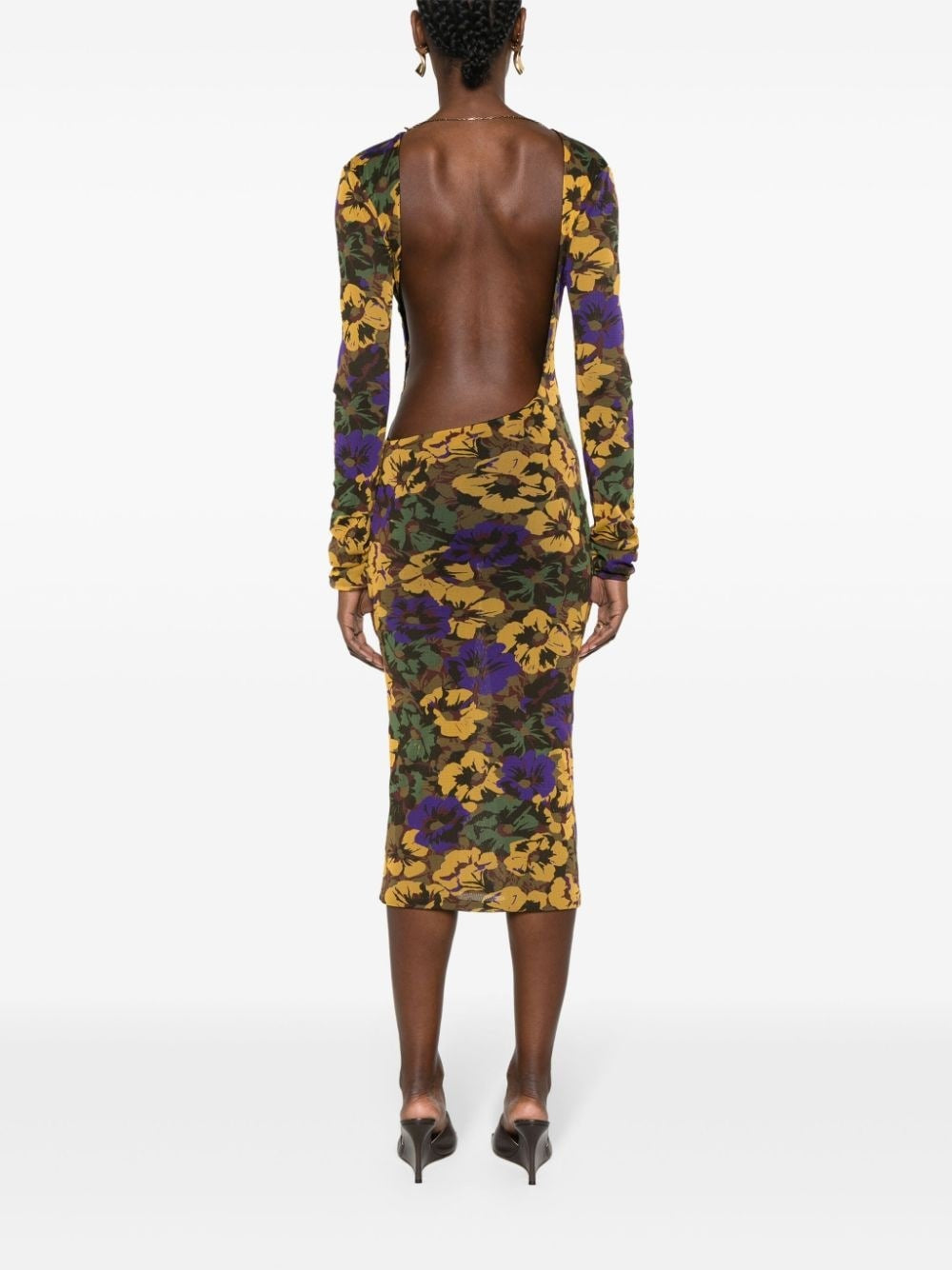 This midi dress features a round neckline and long sleeves for a subtle yet stylish look. Its vibrant floral print, accented with yellow, purple, and green, adds a vibrant, eye-catching touch, making it the perfect choice for this season.