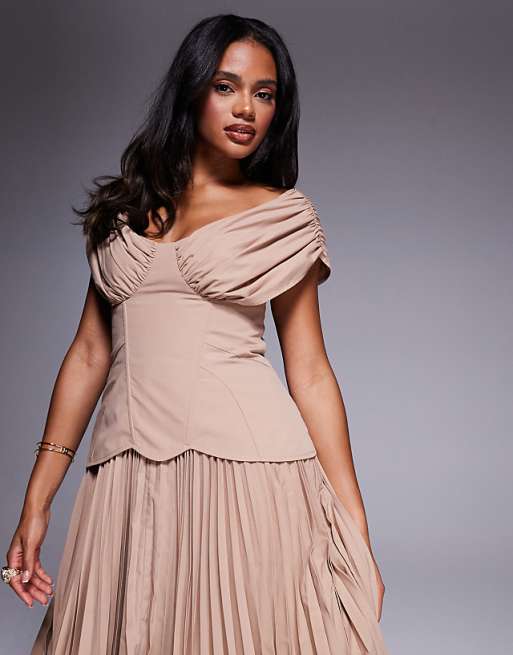 This elegant off-the-shoulder midi dress features a soft beige hue. The bodice is detailed with ruched, off-the-shoulder detailing, flattering the neck and shoulders. The skirt is detailed with delicate pleats, creating an elegant silhouette at the flowing train. Perfect for formal occasions or special events, paired with strappy sandals, this dress exudes refined elegance and timeless charm.