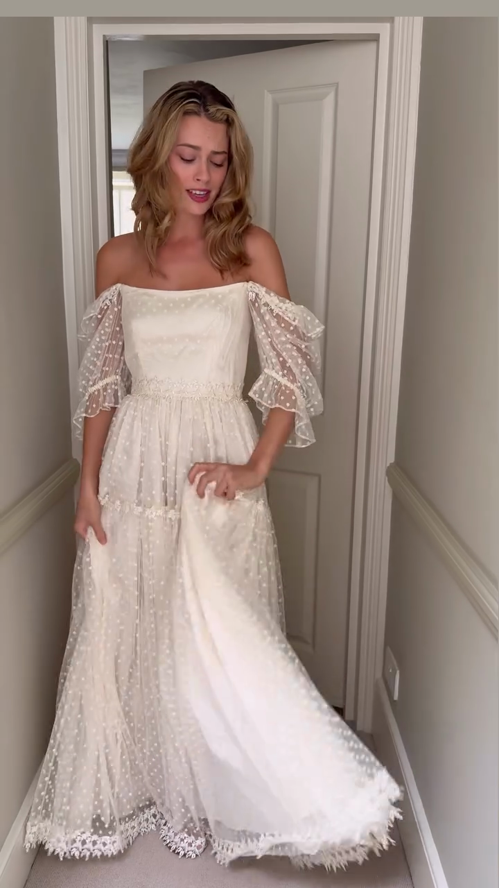 Off-the-shoulder White Polka Dot See-through Maxi Dress