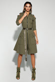 Olive Green Utility - Style Dress with Cut - Out Shoulders It featuring cut - out shoulders, 3/4 sleeves, and multiple pockets. It's cinched at the waist with a belt that has a long, branded strap hanging down. The outfit is completed with matching olive green strappy sandals. This dress combines functional design with a fashion - forward edge, suitable for a stylish yet practical look in various settings.