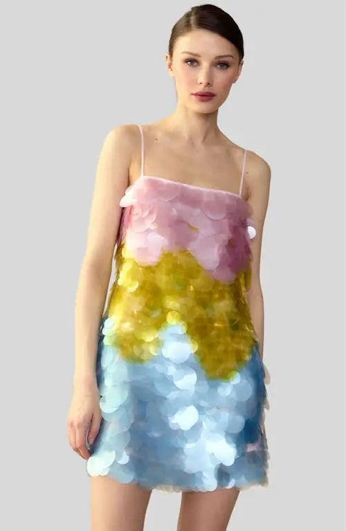 This mini slip dress features spaghetti straps and is embellished with gradient sequins (pink, yellow, and blue) for a dazzling ombré effect. Made from stretch-sequin fabric, it's perfect for parties and clubs—perfect with thin-strap heels.