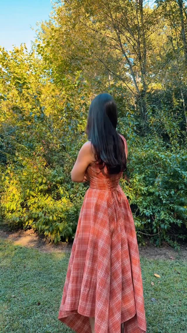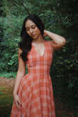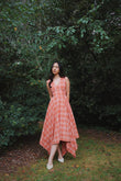 This orange plaid midi dress, with a V-neck and sleeveless silhouette, exudes an elegant, minimalist feel. The asymmetrical hem adds a unique, modern touch and accentuates the figure.
