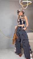 Patchwork Denim Crop Top & Wide - Leg Jeans Set