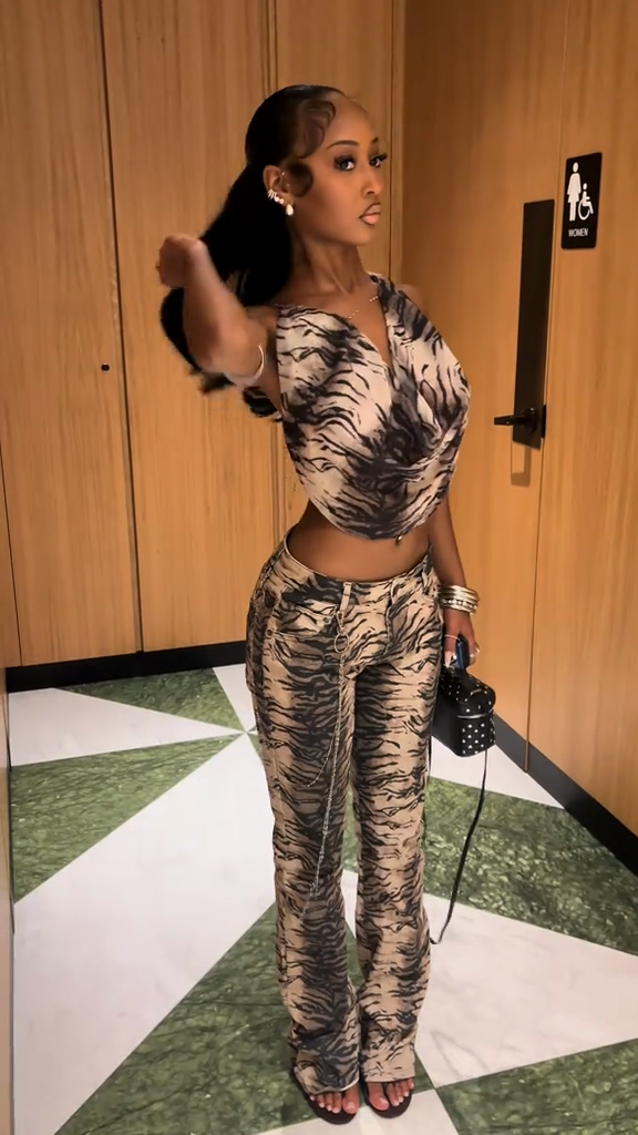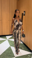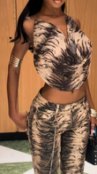 This two-piece set features a striking tiger print design, adding a touch of wild fashion to your look. The eye-catching pattern is the perfect finishing touch. The deep V-neck camisole paired with slim-fit trousers creates a smooth, streamlined silhouette. Its design accentuates your curves, exuding confidence and style. Perfect for a night out, a party, or anywhere you want to stand out. Accessorize with accessories like the bracelet shown and a compact handbag to complete the look.