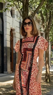 Red and Pink Puff Sleeve Graphic Midi Dress