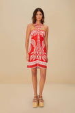 Red Halter - Neck Mini Dress with White Pattern and Fringe Detail