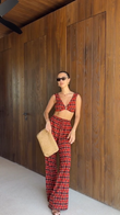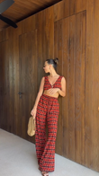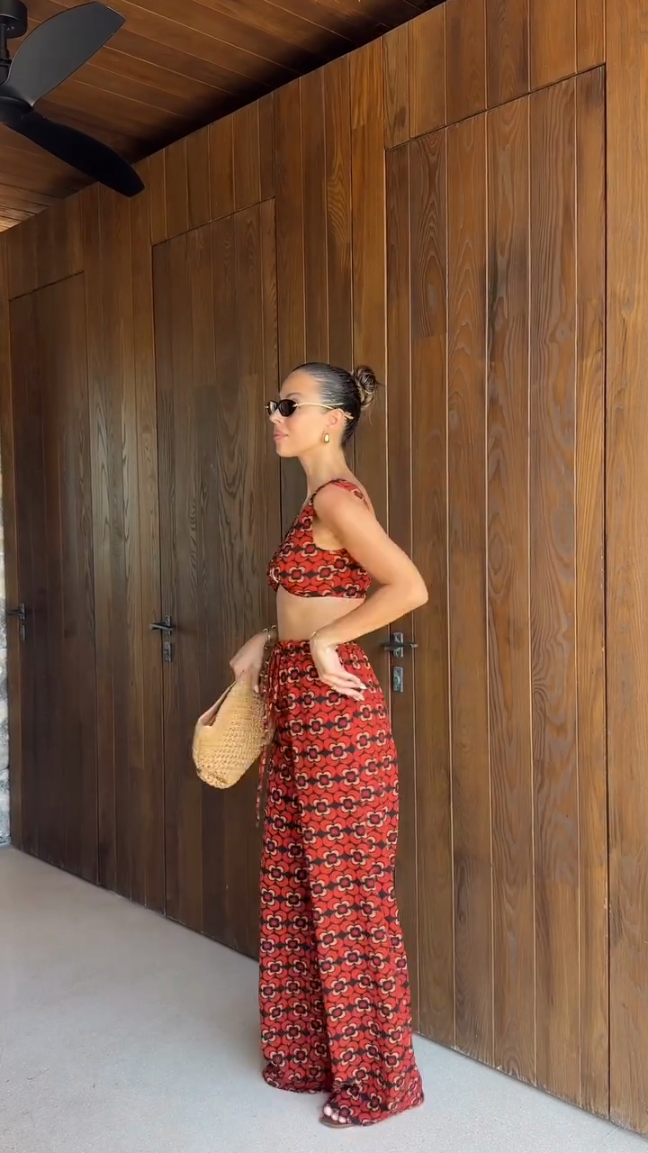 Red Patterned Cropped Top and Wide Leg Pants Set