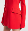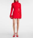 This red mini dress features a stand-up collar and long sleeves for a sleek, sophisticated look. The slim silhouette flatters the figure, and the two front pockets offer both practicality and style.
