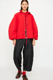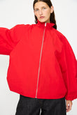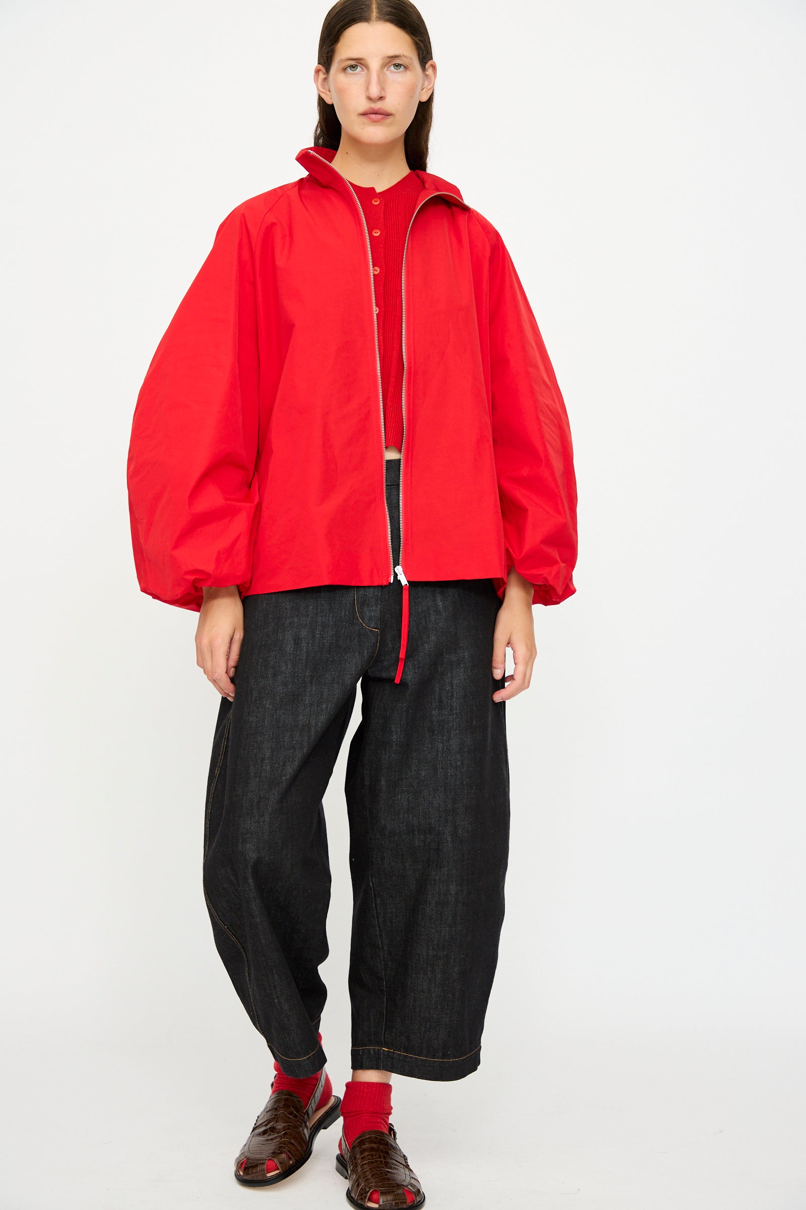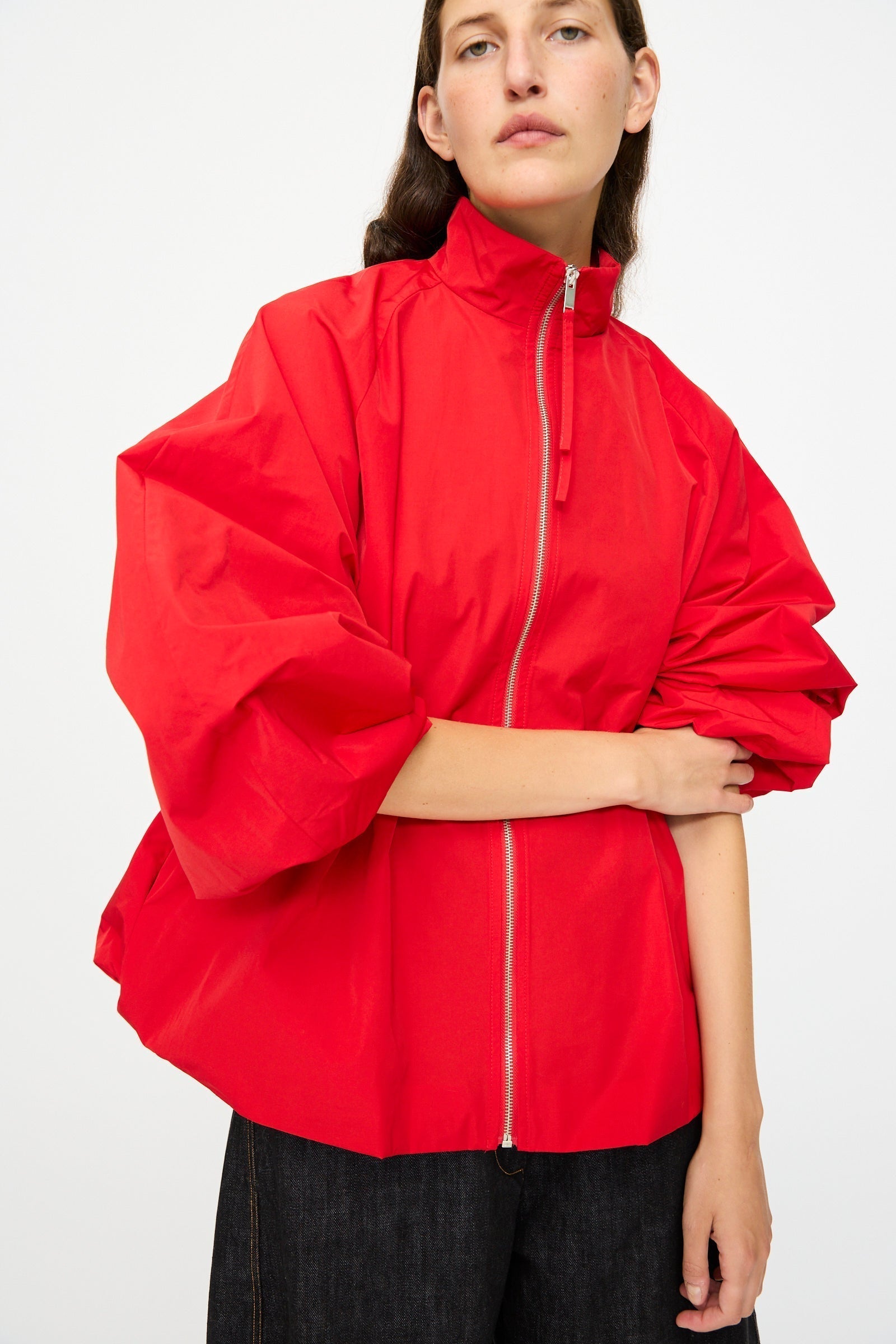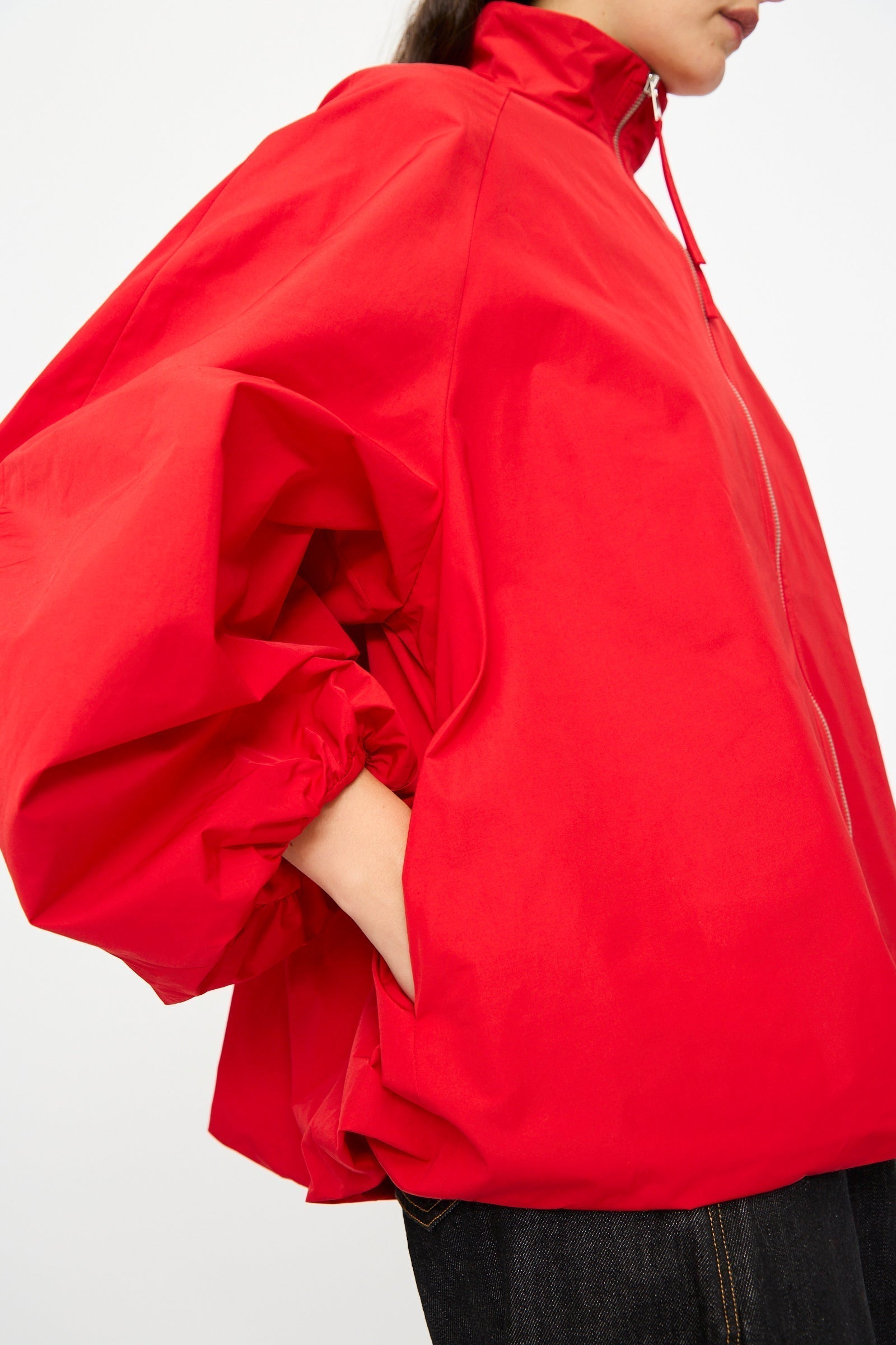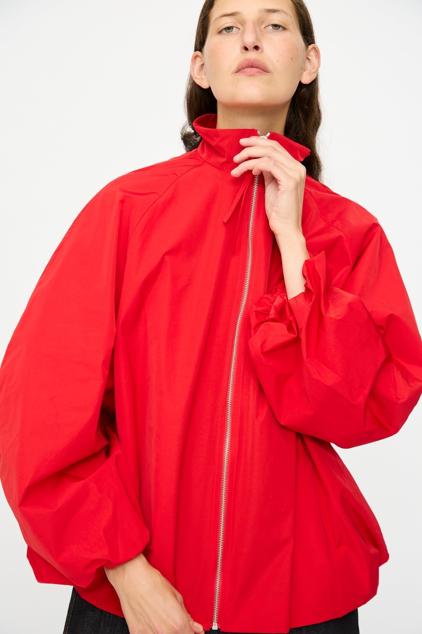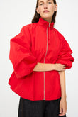 Red Zippered Stand-Collar Puff-Sleeve Jacket