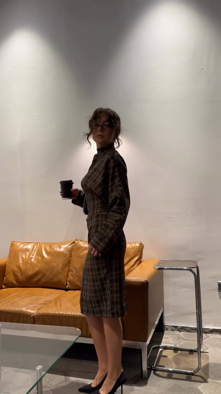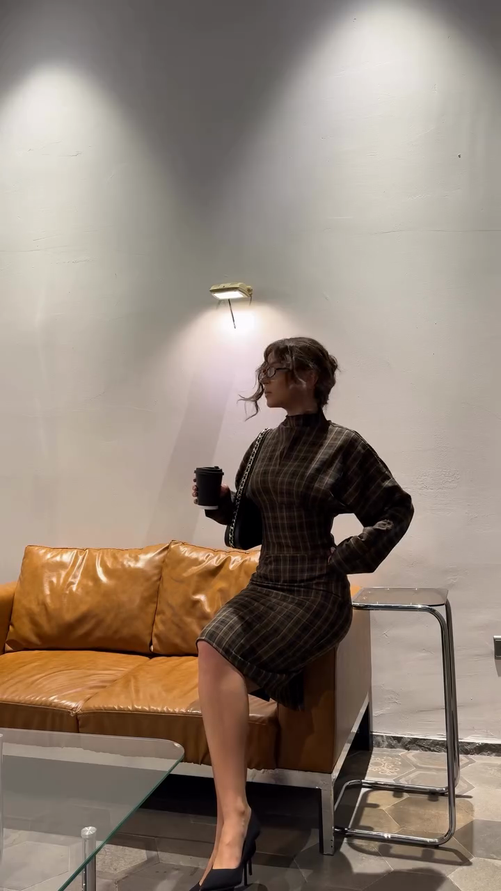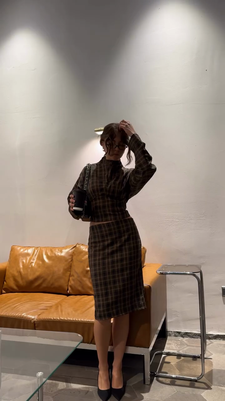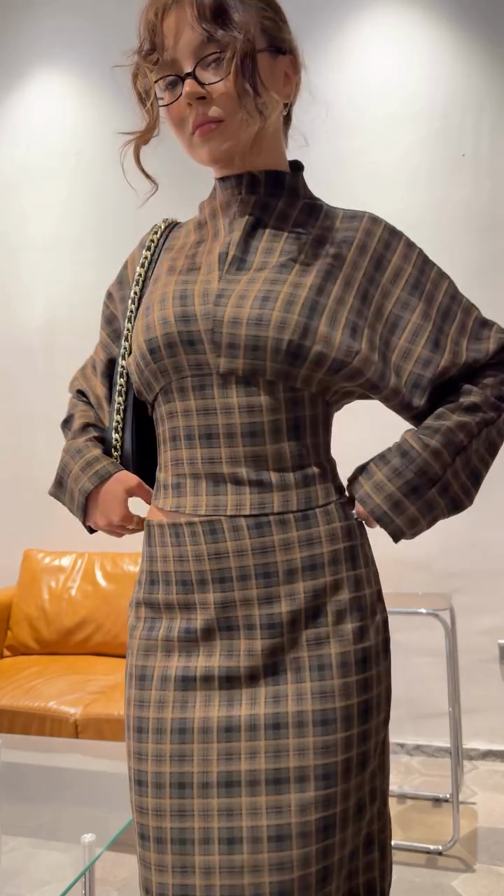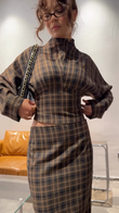 This stylish plaid set consists of a long-sleeved top and a midi skirt, both in a classic plaid pattern. The top features a high neckline and a slightly cropped silhouette, while the skirt has a slim fit for a sleek, streamlined look. Paired with black heels and a compact chain bag, the look is sophisticated and stylish, perfect for any occasion, from work to leisure.