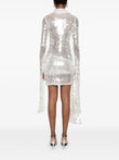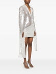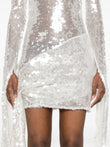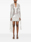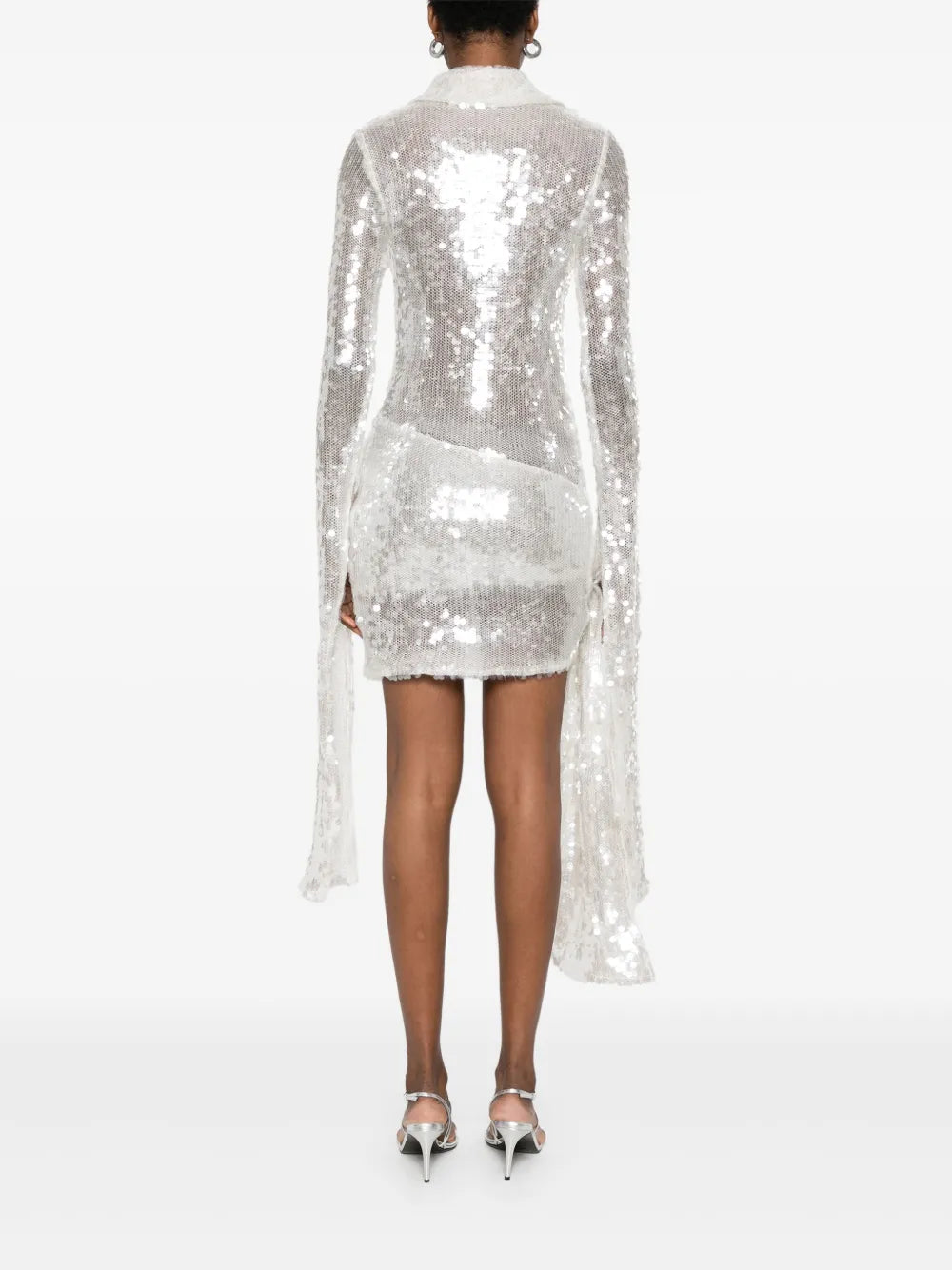 Embellished with shimmering silver sequins, this dress captures light from every angle, radiating unparalleled brilliance. Its flowing long sleeves with dramatic draping add an edgy elegance that's truly captivating. Its slim silhouette and mini-length add a playful, modern touch. The plunging V-neckline exudes sophistication and allure. Perfect for red carpet events, cocktail receptions, or high-end celebrations, this dress is the perfect choice. Pair it with thin-strap heels (like the silver sandals shown) and minimal jewelry for a stylish touch.