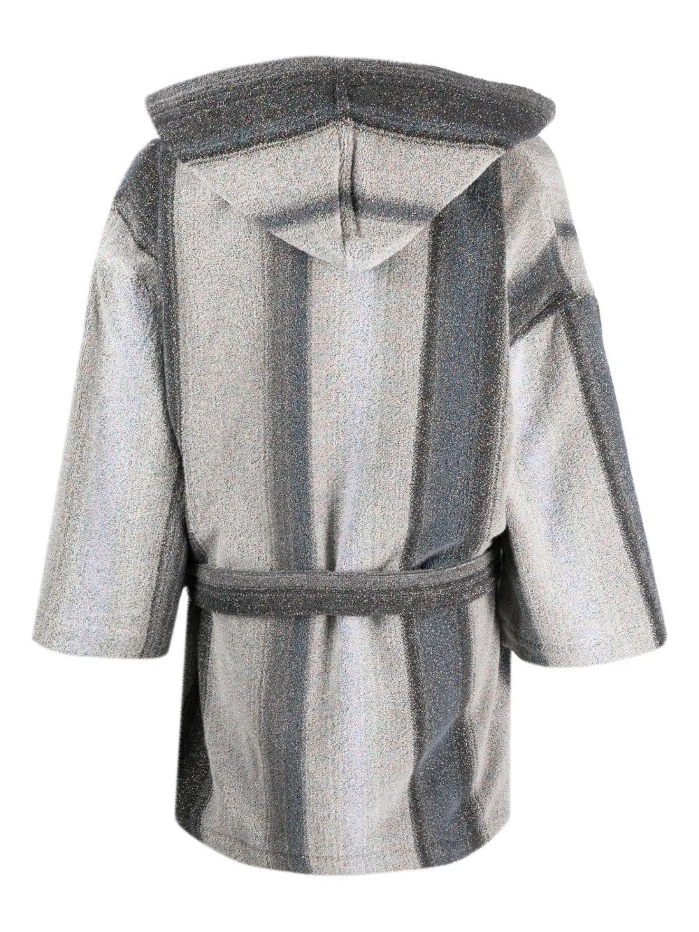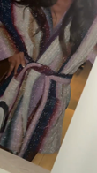 This is a plush robe featuring multicolored stripes, It has a belt that cinches at the waist. The robe gives a cozy, comfortable look, suitable for lounging at home.