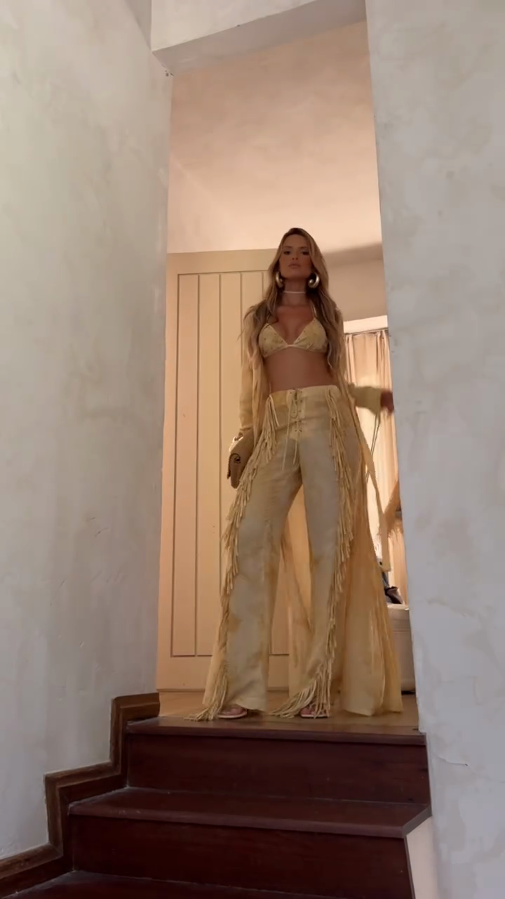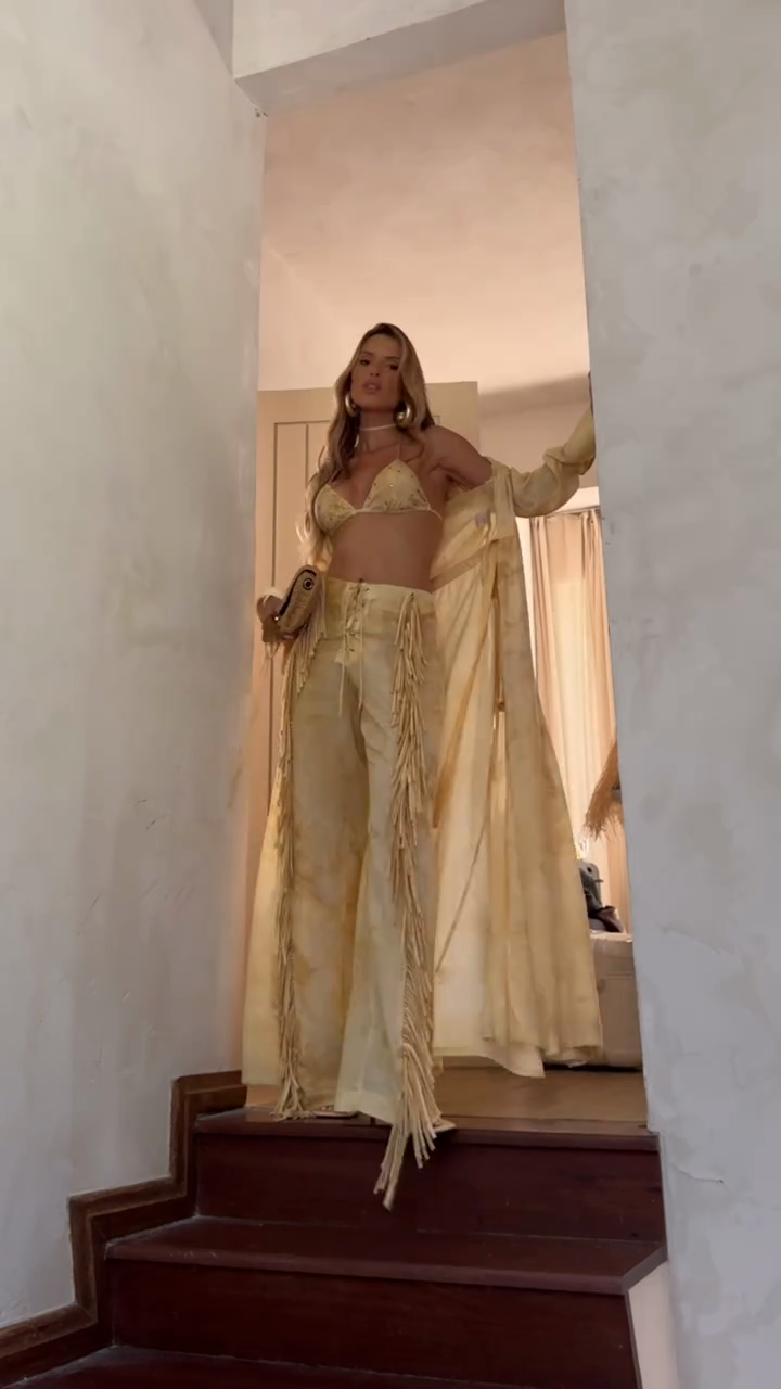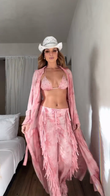 Make a bold, festival-ready statement with this Studded Bikini Top & Fringe Lace-Up Pants Set. The shimmering studded triangle bikini top pairs effortlessly with high-waisted lace-up pants, detailed with long side fringe for movement and flair. Crafted from a soft polyester-spandex blend for comfort and stretch, this set is perfect for concerts, summer events, or standout street style moments.