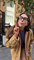 This tan utility - style jacket features a classic design with button - up closures on the sleeves and multiple front pockets, giving it a practical yet stylish look. It's worn over a purple striped top. Paired with large black - framed glasses, gold hoop earrings, and a brown handbag, the outfit exudes a casual, trendy vibe, suitable for everyday wear or a casual day out in an urban setting.