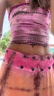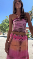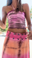 The person is wearing a pink tie - dye halter crop top paired with a matching tie - dye maxi skirt. The top has a halter neck design, and the skirt features a gradient of pink and orange hues, with metal stud embellishments near the waistThis outfit has a bohemian and casual - chic style, suitable for summer events or casual outings.