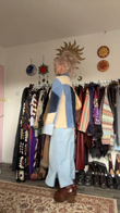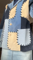 This vintage-inspired patchwork jacket is embellished with blocks of blue, navy, and beige, accented with striking black stitching for a unique, handcrafted feel. Classic notched lapels and a button closure add a touch of formality. Crafted from soft, sturdy suede, it's stylish and comfortable. Pair it with everything from jeans to a skirt for a versatile look, perfect for autumn strolls, antique fairs, or art exhibitions.