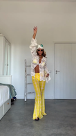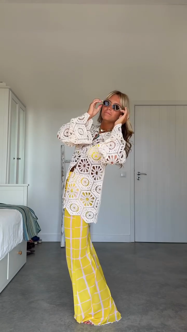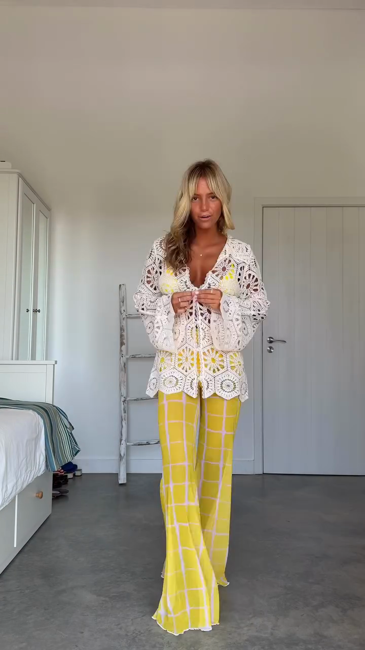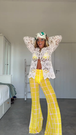 White Crochet Top with Yellow Plaid Pants Outfit