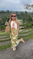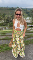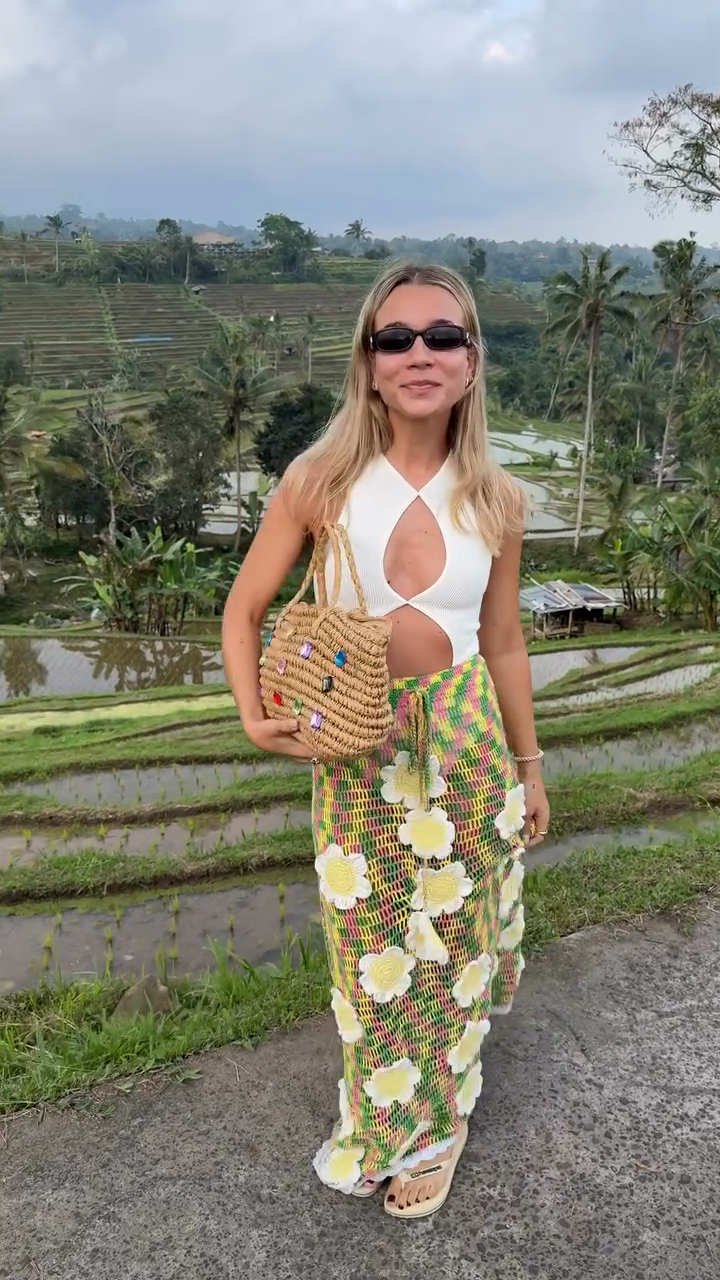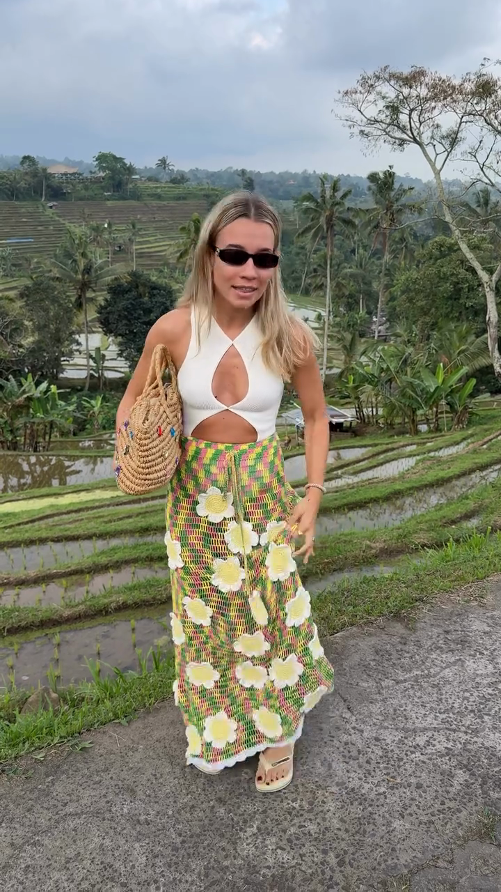 White Cut - Out Halter Top with Floral Crochet Maxi Skirt