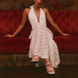 This white maxi dress features a captivating open back and a plunging V-neckline for added allure. The soft, draped bodice seamlessly flows into a delicate lace skirt embellished with a floral pattern, creating a dreamy, elegant silhouette. The fitted bodice accentuates your figure, while the flowing lace skirt adds a touch of elegance and length. It's perfect for formal occasions like weddings, galas, or upscale evenings. The bodice is crafted from premium fabric, while the skirt is embellished with delicate lace, offering both comfort and luxury. The dress's design and fabric complement each other perfectly, allowing you to stand out with your timeless beauty.