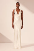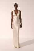 This is a white satin maxi dress featuring a deep V - neckline and lace trim along the neckline and sides. The dress has a sleek, form - fitting silhouette that flows down to the floor. The woman wearing the dress pairs it with simple gold earrings, creating an elegant and sophisticated look suitable for formal events such as weddings, galas, or evening parties.