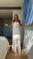 This outfit features a white strapless ruched top that cinches at the waist, creating a flattering silhouette with a small cut - out detail. Paired with wide - leg white pants, the ensemble gives a clean, elegant, and sophisticated look. It's suitable for semi - formal events, summer parties, or upscale casual outings, exuding a minimalist yet stylish vibe.