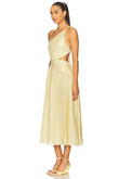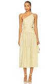 This is a yellow and white striped midi dress. It features a one - shoulder design with thin spaghetti straps on the other side, and a cut - out detail at the waist. The dress has a flowing skirt that reaches the mid - calf. The woman wearing the dress pairs it with yellow strappy high - heel sandals and holds a small, light - colored handbag, creating a bright and stylish look suitable for summer events or casual outings.